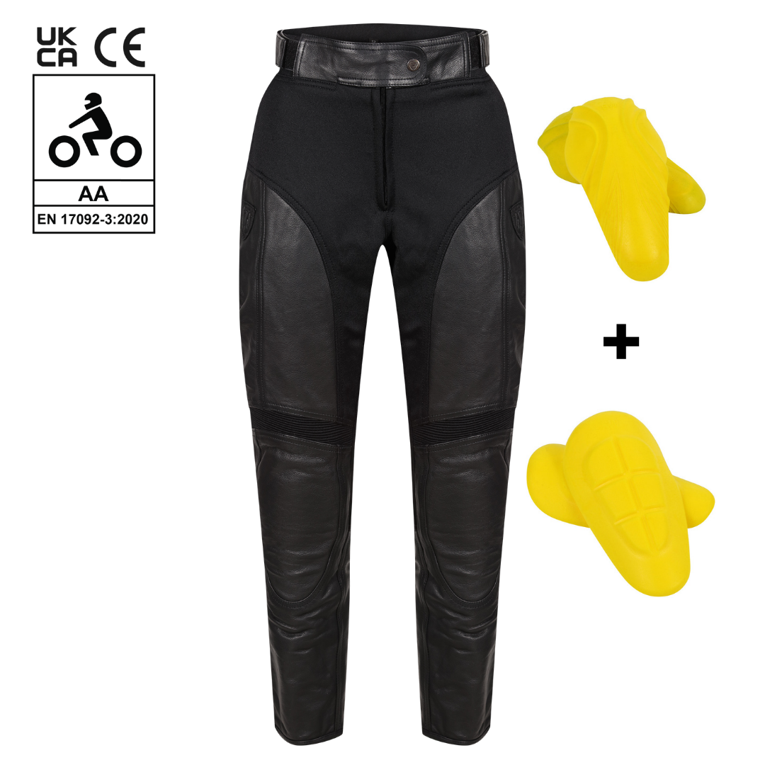 Fitting: The Fiona Trousers have stretch panels around the rear and back/inside leg. This makes them a great choice for anyone who struggles to find leathers to fit due to their bigger calves. The waist adjusters also allow any gaps at the back to be cinch in instantly (for those with bigger hips and smaller waists!) If you are in between sizes, we suggest going for the larger of the two.